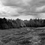 La démarche photographique de Christophe Boulard se construit à l’inverse de ces allégations puisque son intention, fortement marquée par le titre de sa série Mémoire en paysages, est de saisir, à partir de sa considération des lieux, la survivance d’une époque infernale, moins à travers des vestiges, des épaves ou des ruines que par les variations de la lumière dramatisée par l’usage de la photographie en noir et blanc. Le choix des cadrages permet ainsi de confronter le doux nuancier du gris des nuages au chatoiement obscur des sols ravinés en premier plan et des arbres calcinés par un effet de contrejour.